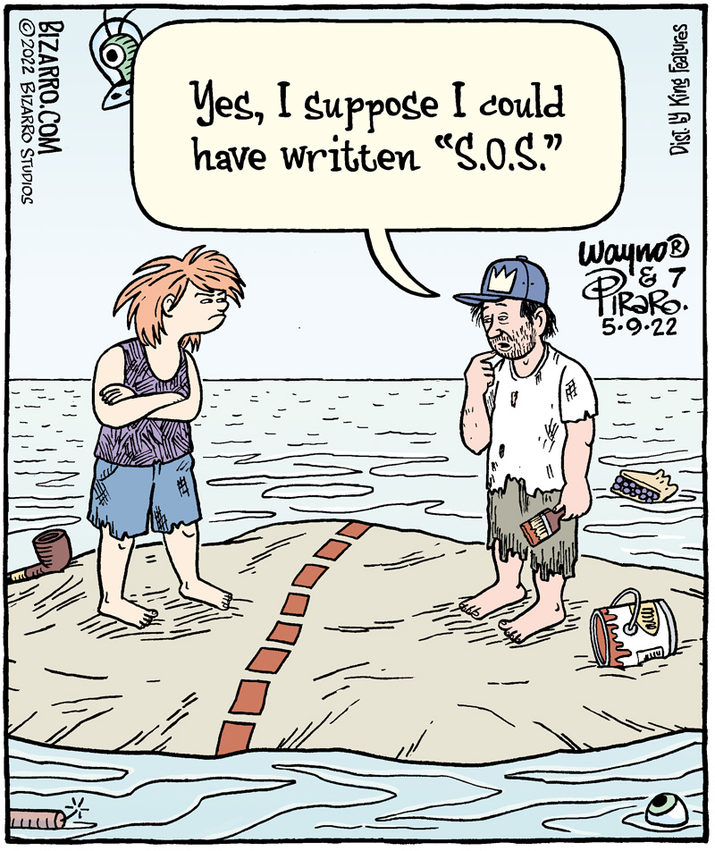 This is the weekly communiqué from Bizarro Studios North, where I (Wayno®) have been writing and drawing the Monday through Saturday Bizarro comics since 2018. My partner and friend, Dan Piraro, who created Bizarro in the late twentieth century, continues to do the Sunday comic from Rancho Bizarro in Mexico.