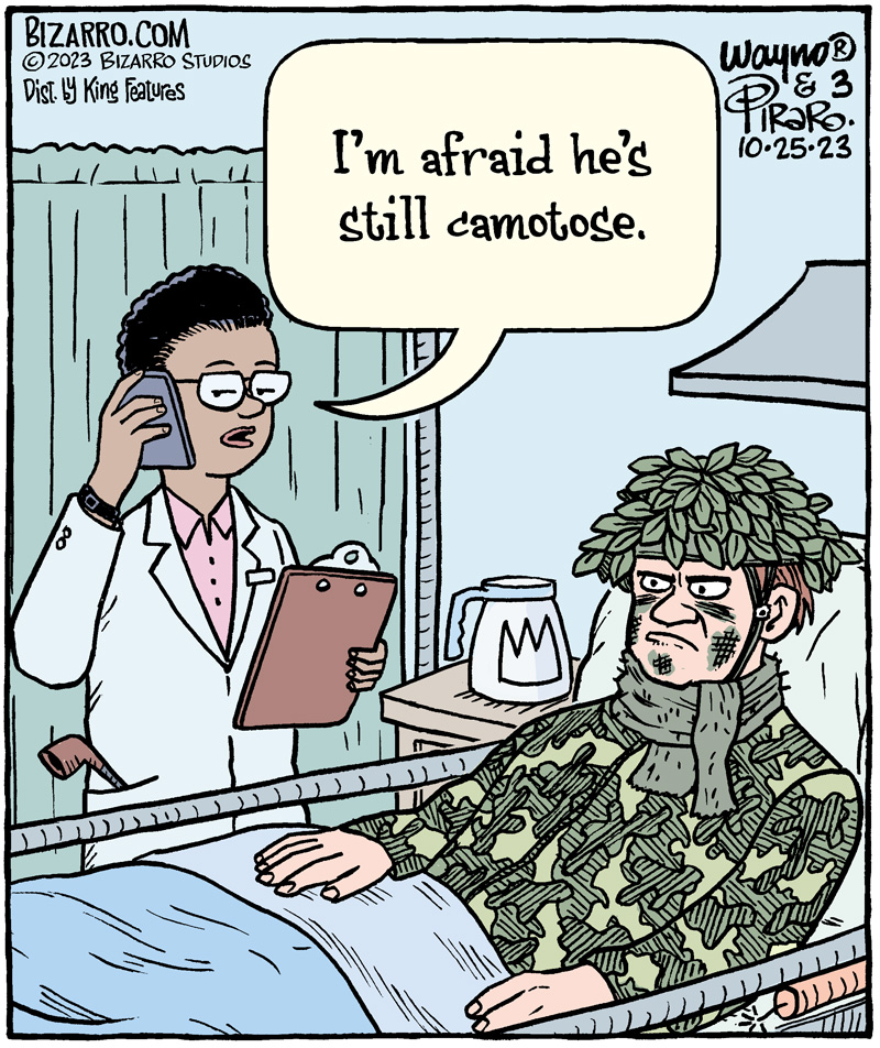 This is the weekly dispatch from Bizarro Studios North, where I have been writing and drawing the Monday through Saturday Bizarro comics since 2018. My partner and friend Dan Piraro created Bizarro in the late twentieth century and continues to do the Sunday comic from Rancho Bizarro in Mexico.